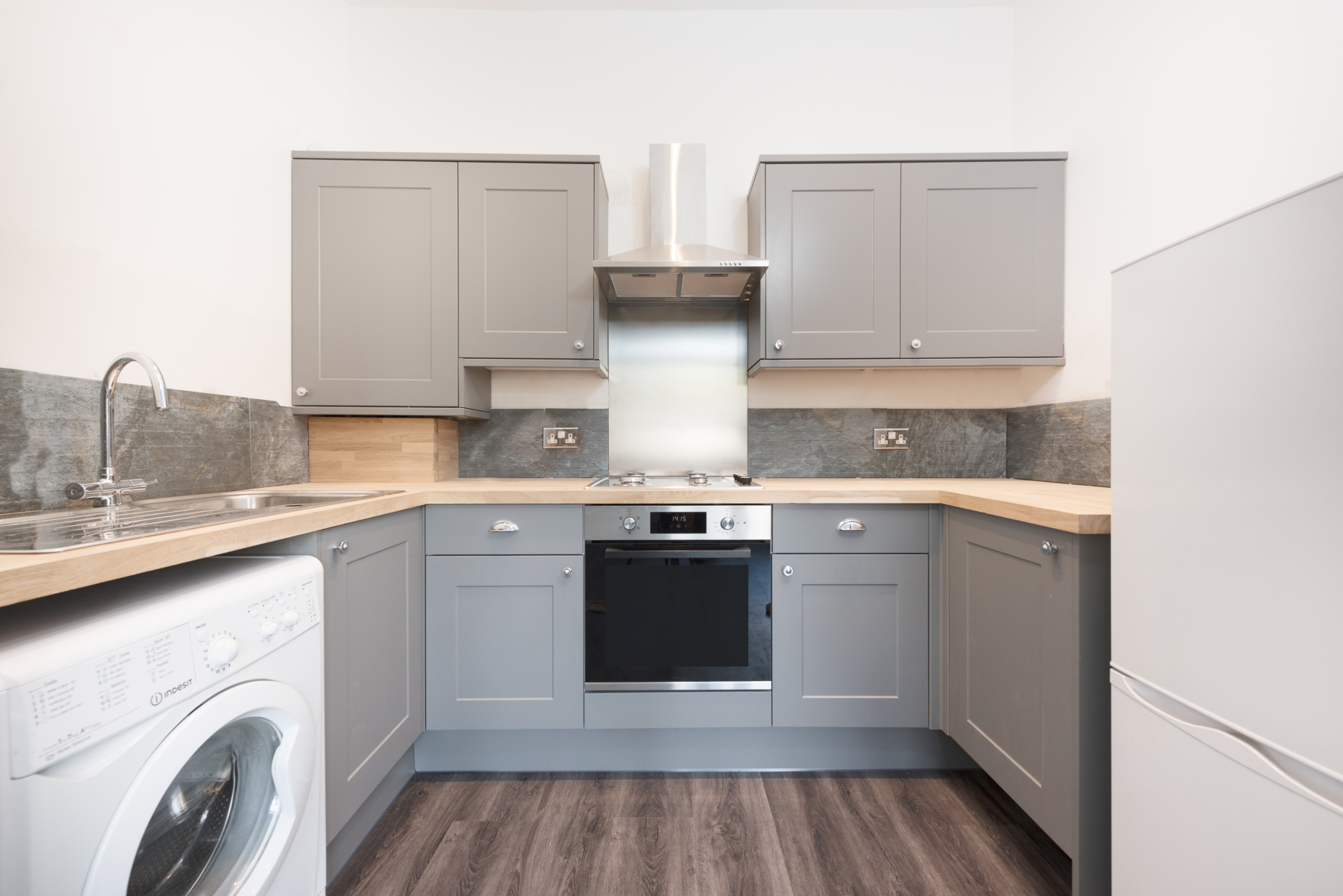 The kitchen features a gas hob, a washing machine, and a large fridge freezer.