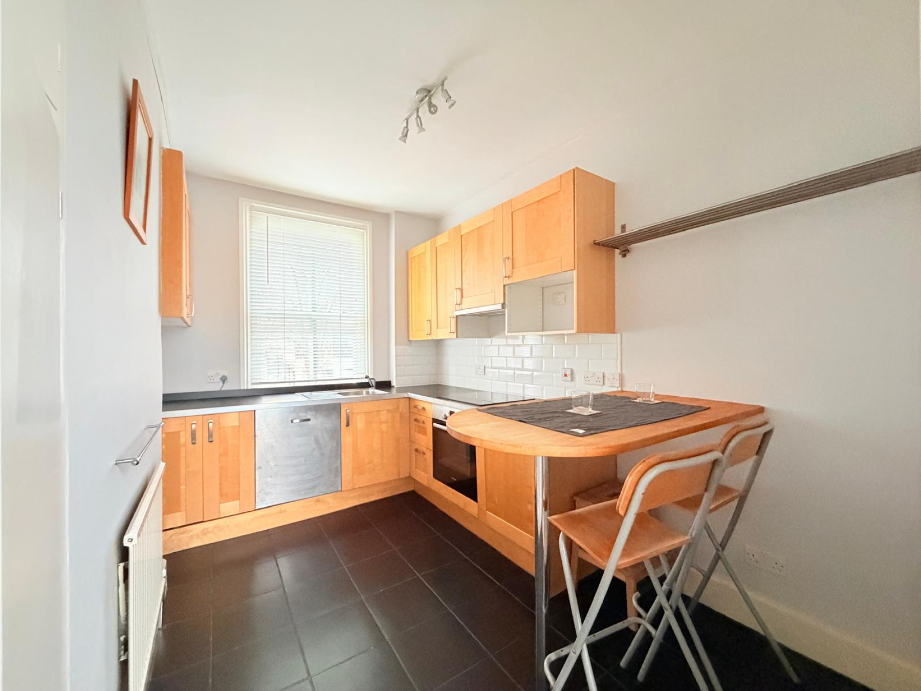 The kitchen is fitted with an undercounter fridge-freezer, electric hob, oven, and dishwasher.